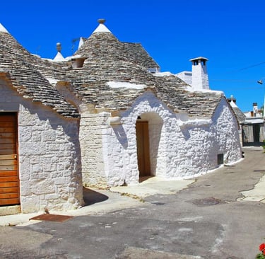 Alberobello'nun en belirgin özelliği olan Trulli evleri, kireçtaşından yapılmış, beyaz badanalı ve konik çatılı yapılardır.