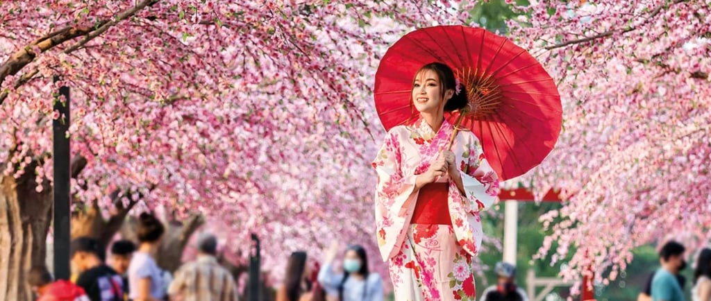 İnsanlar parklarda ve bahçelerde toplanarak kiraz çiçeklerinin güzelliğini seyrederler.